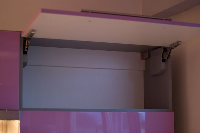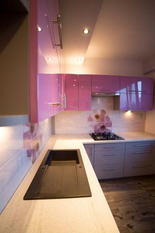 Wykonywaliśmy kuchnię z frontami lakierowanymi. Zaproponowaliśmy połączenie nowoczesnych rozwiązań z klasyką. Zaprojektowaliśmy maksymalnie dużo szuflad, szafkę Cargo, szafkę narożną dolną z kołowrotem. W zabudowie zmieściliśmy zmywarkę, ociekacz, pochłaniacz, piekarnik oraz płytę gazową. Dopełnieniem całości są szafki otwierane do góry na niezawodnym systemie BLUM AVENTOS HK-S. Kolory, które wybrali właściciele są odważne, jednak ta kuchnia w całości, naprawdę robi wrażenie.