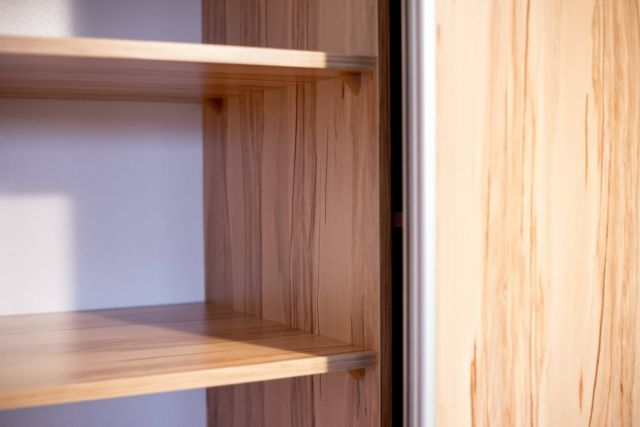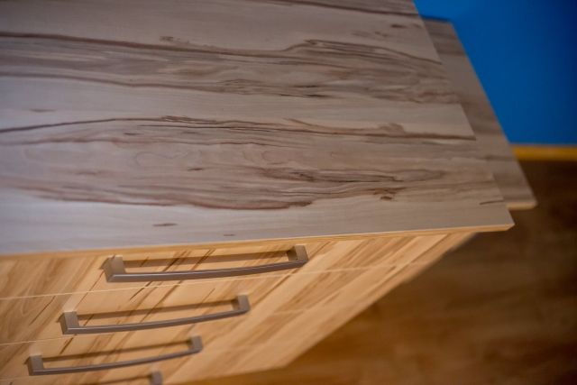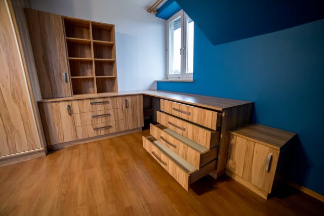 Właściciele wybrali płytę w kolorze Jabłoń Twardzielowa, która fajnie komponuje się z biało- niebieskim wnętrzem pokoju. Meble wykonane są na mechanizmach Blum oraz Sevroll. Wszystkie szuflady są z samodociągiem, a fronty wyposażone zostały w spowalniacze zapobiegające głośnemu uderzaniu drzwiczek w korpusy szafek.