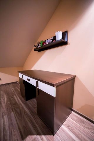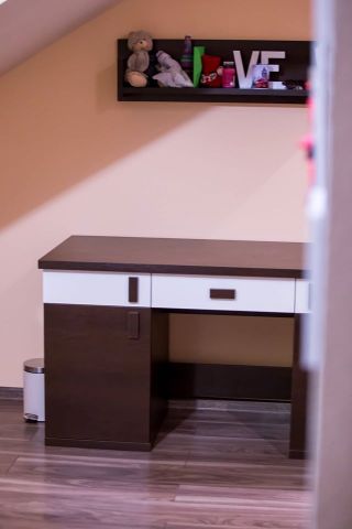 Biurko o wymiarach blatu 150x65 cm i wysokości 80cm powstało w taki sposób, by pasowało do pozostałych mebli wizualnie, ale jednocześnie, aby było bardziej wytrzymałe niż sklepowe (sieciówka).