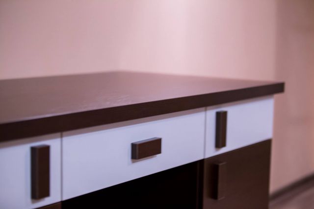 Blat oraz dolna część szafek jest wykonana z pogrubionej płyty. Dzięki zaprojektowaniu dwóch szafek oraz 3 szuflad biurko jest naprawdę pojemne i funkcjonalne. Szuflady pracują na prowadnicach kulkowych na pełen wysuw z hamulcem i samodociągiem. Całość zyskuje dzięki połączeniu dwóch kolorów płyt Sosny Laredo Ciemnej i Kremu z którego są fronty szuflad.