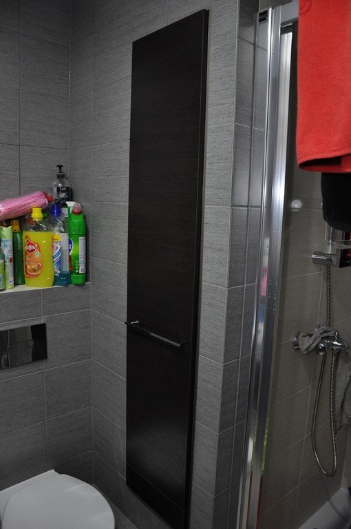 Szafka wnękowa, która ma za zadanie zamaskować rury hydrauliczne, dając jednocześnie przestrzeń szafkową i dostęp do licznika wody.