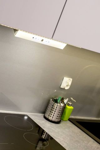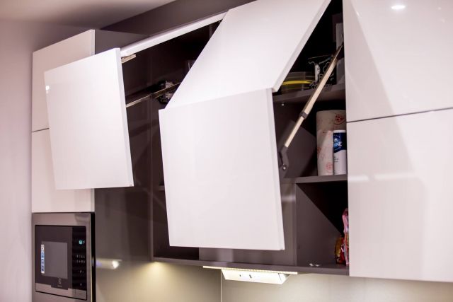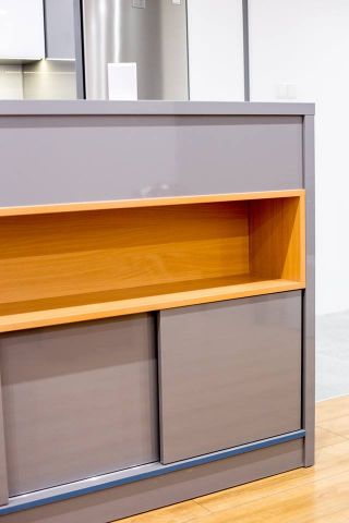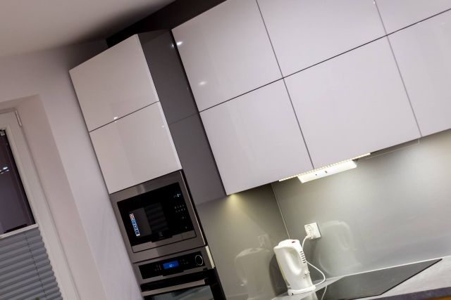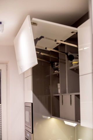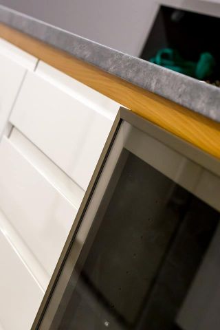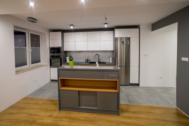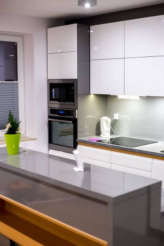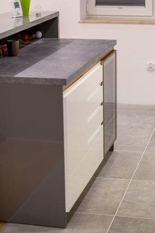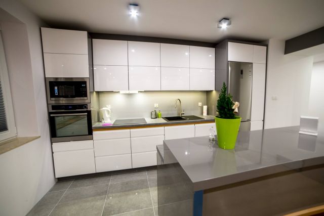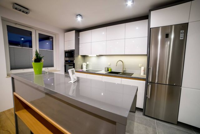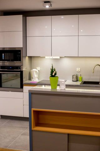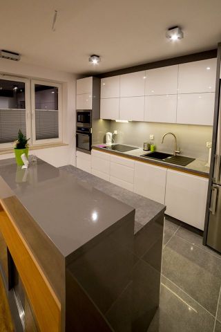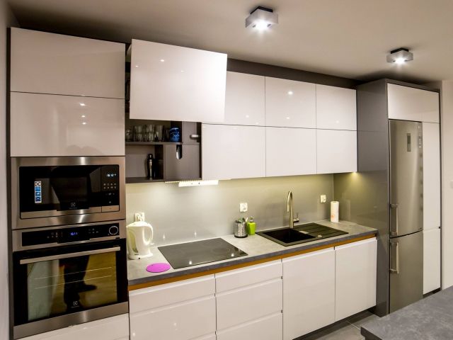 Kuchnia ciekawie i fajnie wpisuje się w całość pomieszczenia dzięki wyspie. Założenie było takie, aby maksymalnie wykorzystać wysokość pomieszczenia. Osiem górnych frontów zostało połączone w pary i unoszą się po dwa na specjalnym systemie BLUM HF AVENTOS, aby dostęp do tak wysokich szafek był możliwy. Dół to zmywarka, szafka pod zlewem z elektrycznym wspomaganiem otwierania BLUM SERVO-DRIVE UNO oraz 6szuflad BLUM TANDEM. Po lewej stronie kuchni znalazł się słupek z piekarnikiem i mikrofalówką, który na dole ma 2 szuflady, a u góry dwie pojemne szafki. Po prawej stronie zabudowana jest lodówka wolnostojąca, nad którą powieszona została szafka. Obok lodówki znalazł się 30 centymetrowy kosz Cargo, wysokości 180 cm z dociągiem. Wszystkie fronty posiadają frezowane uchwyty i są lakierowane na biało w połysku. Równowagę między pokojem, a kuchnią zapewnia wyspa, która od strony kuchni posiada dwa blaty, szafkę z aluminiowym frontem i szybą oraz cztery szuflady. Zróżnicowana wysokość blatów tworzy dyskretną przestrzeń roboczą, która od strony pokoju jest zupełnie nie zauważalna. Przebywając w pokoju widzimy półkę, która jest zagłębieniem w wyspie i wykonana jest z płyty w kolorze Buk Bavaria. Ta płyta jest również motywem, oddzielającym blaty od frontów w całej kuchni. Poniżej wspomnianej półki, znajduje się szafka zamknięta trzema przesuwnymi drzwiami w kolorze całości czyli Grafit Jasny w połysku.